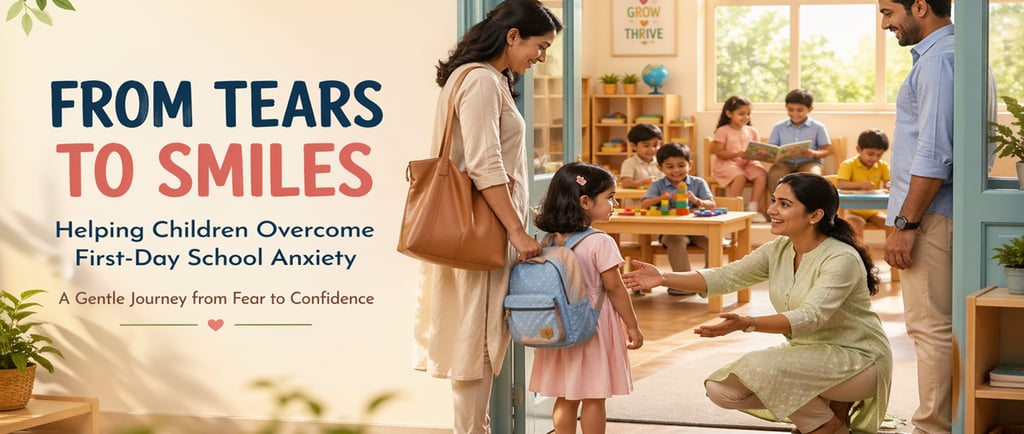 Blog post description.यह ब्लॉग पोस्ट छोटे बच्चों, खासकर मोंटेसरी आयु के बच्चों, में स्कूल शुरू करते समय होने वाली मम्मी-पापा से बिछड़ने की चिंता (Separation Anxiety) को सरल और भावनात्मक तरीके से समझाता है। रिया की प्यारी कहानी के माध्यम से बताया गया है कि प्यार, धैर्य, सहयोगी शिक्षक और सकारात्मक माहौल कैसे बच्चे के डर को आत्मविश्वास और खुशी में बदल सकते हैं। यह माता-पिता और शिक्षकों के लिए उपयोगी मार्गदर्शन भी देता है।